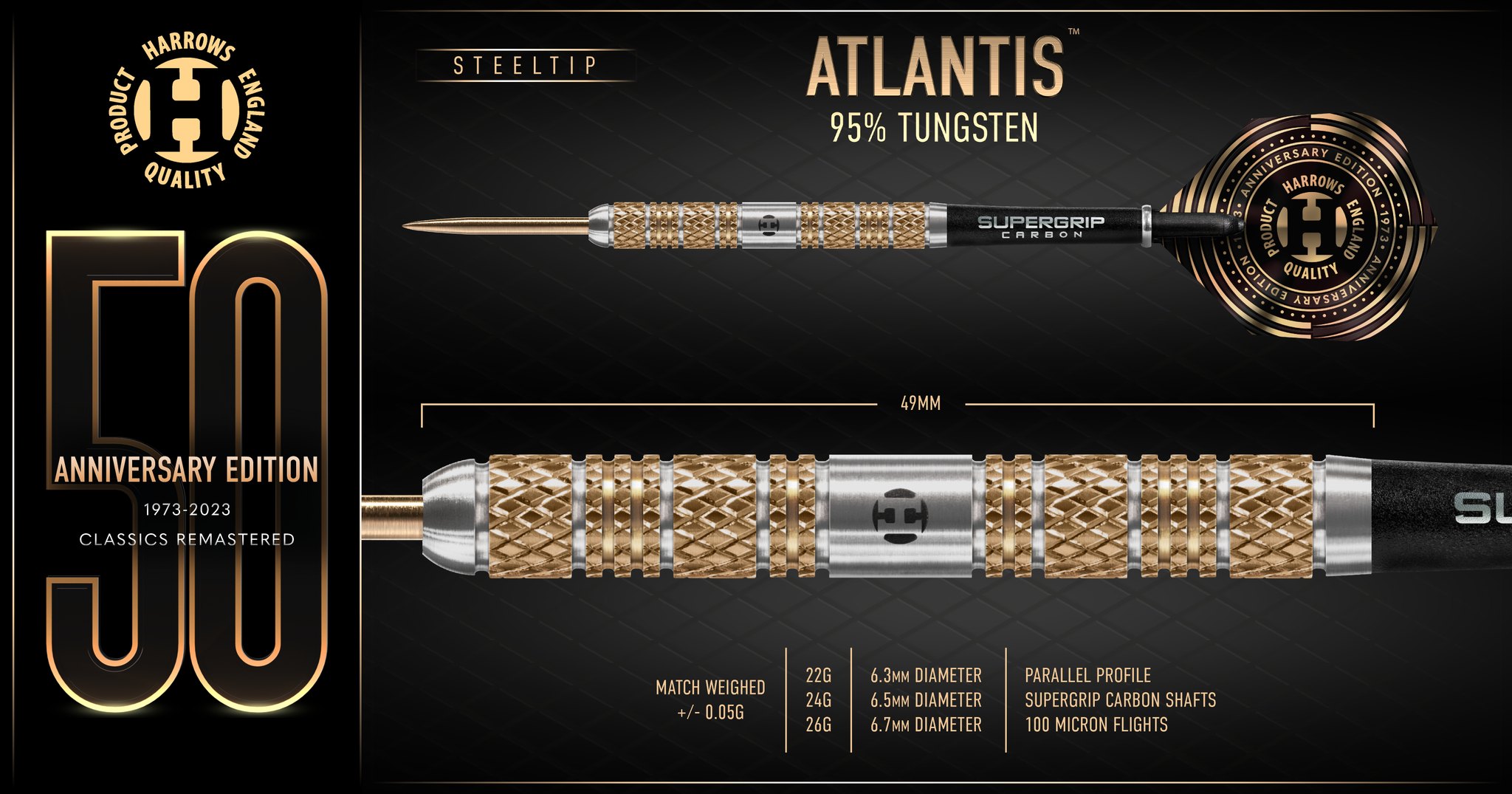 Rzutki Atlantis to kolejny kamień milowy w naszej historii, ponieważ były to pierwsze rzutki wykonane w 95% z wolframu, jakie kiedykolwiek wypuściła firma Harrows.
